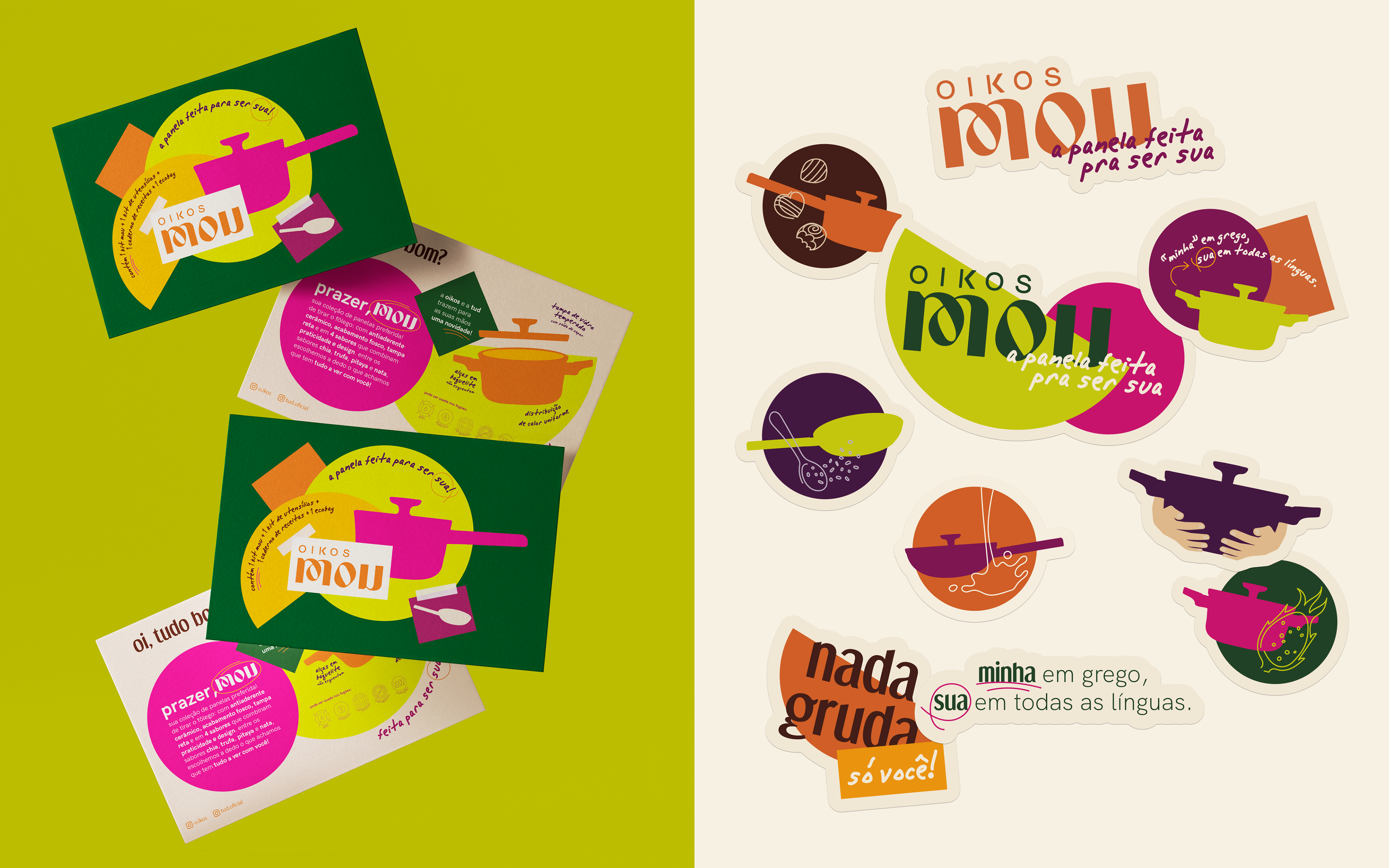 On the second one, we brought the ludic aspect, which is very present in the Oikos brand. We took the opportunity to immerse the pots in their visual universe, reinforcing the line’s visual identity colors and the flavors that named each one.