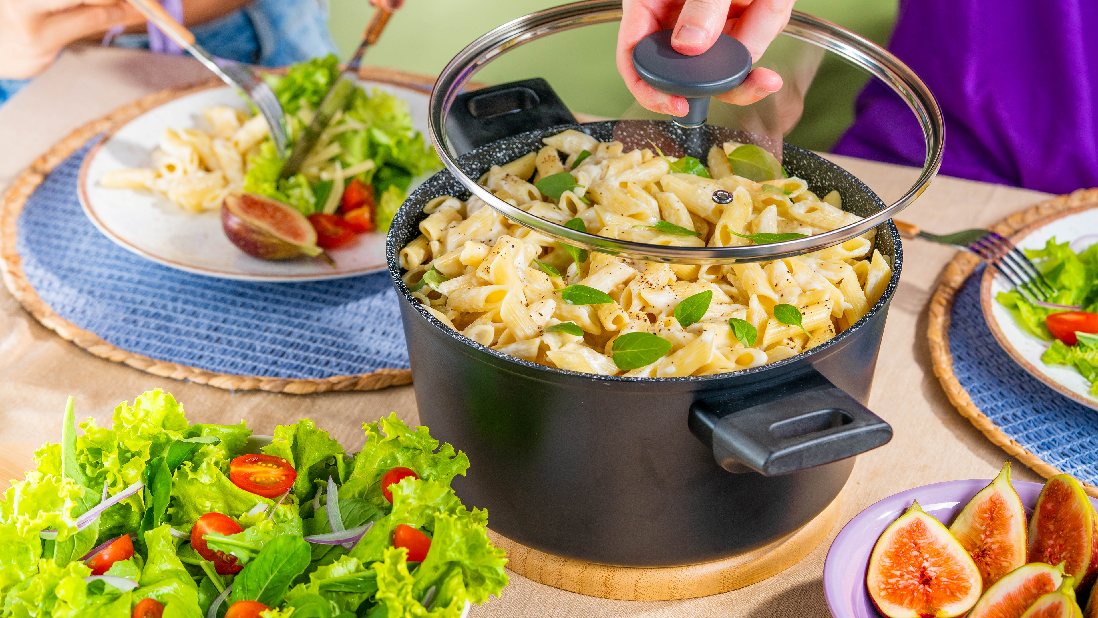 The third approach was more commercial. Focusing on the marketplaces where Mou would be sold and its digital presence, we placed the pots in four different common situations, like a family dinner or an outdoor lunch with friends, each with its own particular mood. This highlighted one of the line's key assets: its differentiated design and beauty, making the pots something to proudly display on the table.